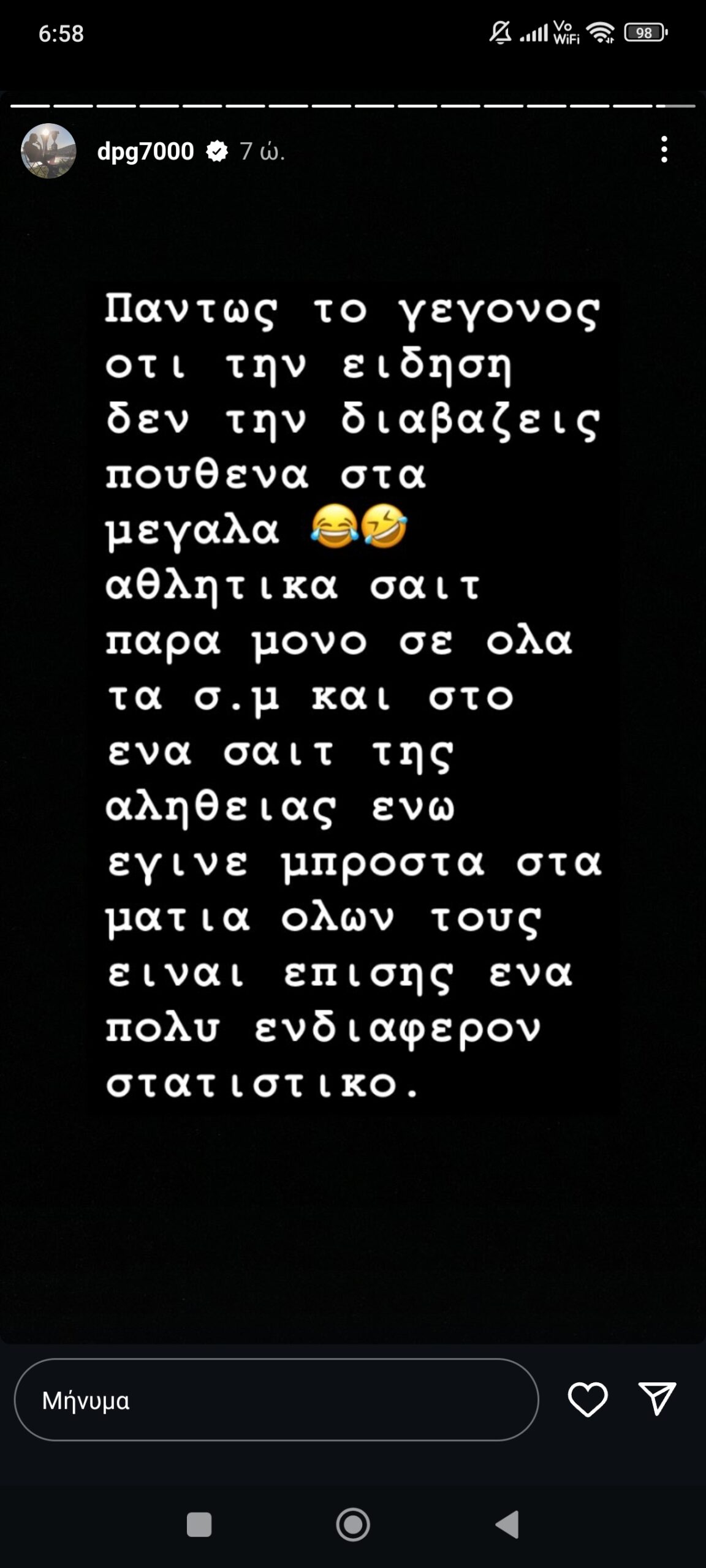 Παντως το γεγονος οτι την ειδηση δεν την διαβαζεις πουθενα στα μεγαλα – αθλητικα σαιτ παρα μονο σε ολα τα σ.μ και στο ενα σαιτ της αληθειας ενω έγινε μπροστα στα ματια ολων τους ειναι επισης ενα πολυ ενδιαφερον στατιστικο.