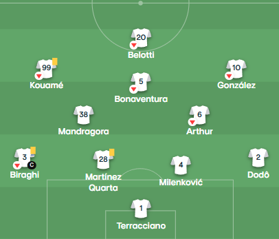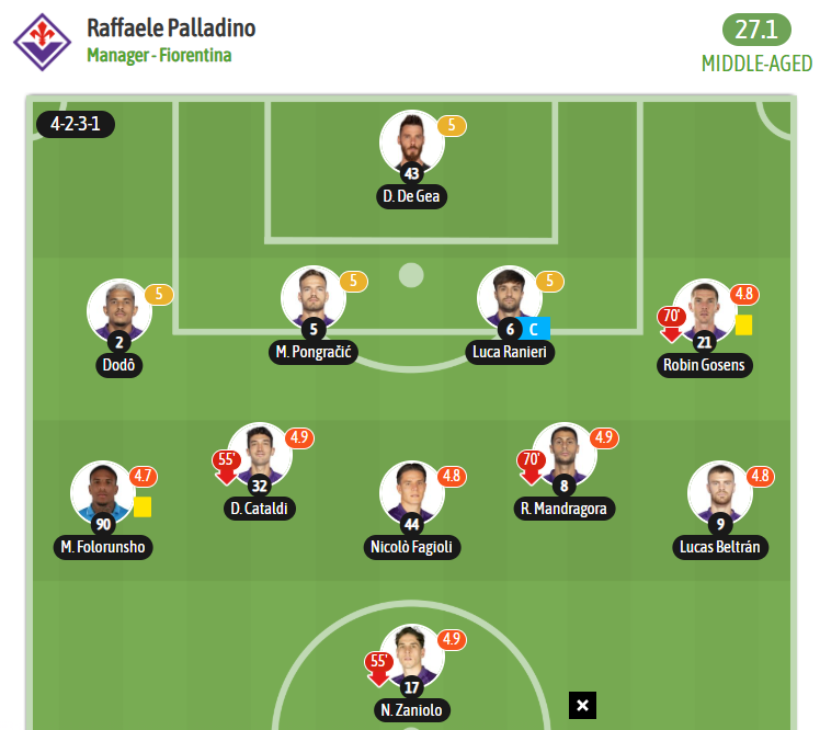 Η Φιορεντίνα στο τελευταίο παιχνίδι με την Κόμο (0-2): Ντε Χέα, Ντοντό, Πόνγκρατσιτς, Ρανιέρι, Γκόσενς, Κατάλντι, Μαντραγκόρα, Φαγιόλι, Φολορούνσο, Μπελτράν, Ζανιόλο (Ραφαέλε Παλαντίνο)