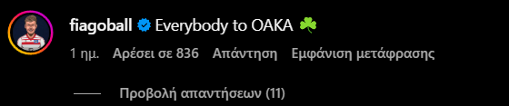 «Όλοι ΟΑΚΑ», έγραψε χαρακτηριστικά στην ανάρτηση στο Instagram προσθέτοντας και ένα τριφύλλι.