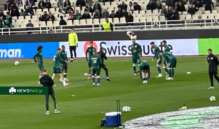 Στον αγωνιστικό χώρο του ΟΑΚΑ βγήκαν οι ποδοσφαιριστές του Παναθηναϊκού για την προθέρμανσή τους.