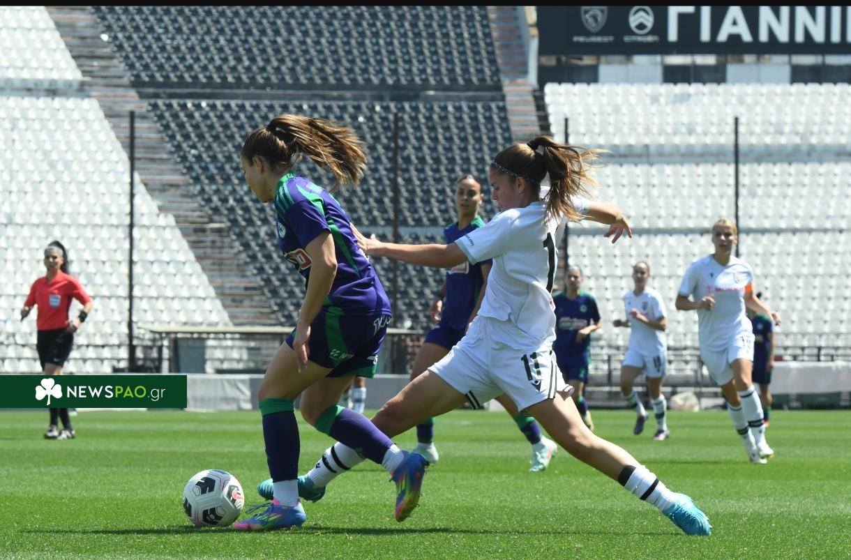 Το πρώτο ημίχρονο κύλησε με τον ΠΑΟΚ να έχει τον έλεγχο του αγώνα, κρατώντας περισσότερη ώρα τη μπάλα και προσπαθώντας να δημιουργήσει ευκαιρίες. Ο Παναθηναϊκός από την πλευρά του προτίμησε να αμυνθεί και να κλείσει τους χώρους. Οι «ασπρόμαυρες» πίεσαν κυρίως από δεξιά με τη Μανίσα να είναι αρκετά δραστήρια, δοκιμάζοντας στο 29′ ένα σουτ που έφυγε εκτός. Πέντε λεπτά αργότερα, η Παπαδοπούλου απείλησε με κεφαλιά χωρίς επιτυχία.