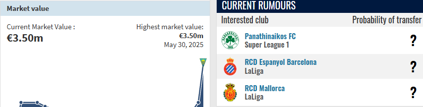 Η χρηματιστηριακή αξία του Μαροκινού «κίλερ» ανέρχεται στα 3.5 εκατ. ευρώ σύμφωνα με το Transfermarkt. Μάλιστα, ο Παναθηναϊκός εμφανίζεται ανάμεσα στις πιθανές ομάδες για να τον αποκτήσει.