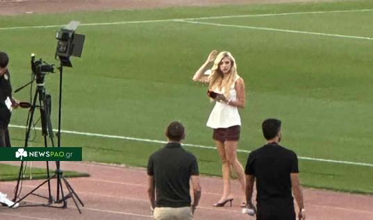 Η Ντάρια Μπόνταρ ξεχώρισε με το… καλησπέρα στο Ολυμπιακό Στάδιο της Αθήνας την ώρα που οι φίλαθλοι του Παναθηναϊκού περιμένουν να δουν τις δύο ομάδες στον αγωνιστικό χώρο.