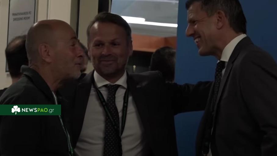 Από τα πλάνα που δόθηκαν στο φως της δημοσιότητας, ο μεγαλομέτοχος της «πράσινης» ΠΑΕ κουβέντιασε με τους Γιάννη Παπαδημητρίου και Τάκη Φύσσα και οι τρεις άνδρες φάνηκαν να έχουν πολύ καλή διάθεση.