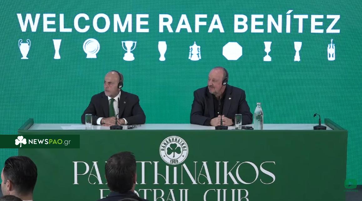 «Κυρίες και κύριοι, καλή σας μέρα. Θέλω να σας ευχαριστήσω που είστε εδώ σήμερα. Η παρουσία σας συνδέεται με μία πάρα πολύ σημαντική στιγμή για τον Παναθηναϊκό. Ο Παναθηναϊκός προχωρά μπροστά, με σχέδιο και αποφασιστικότητα, και ξεκάθαρο στόχο: να επιστρέψει στην κορυφή του ελληνικού και ευρωπαϊκού ποδοσφαίρου. Η σημερινή ημέρα δεν είναι απλά μία αρχή. Είναι η επιβεβαίωση ότι ο σύλλογος αλλάζει επίπεδο. Στο πλαίσιο μίας συνολικής αναδιοργάνωσης και αναβάθμισης. Τόσο του ποδοσφαιρικού και διοιηκτικού τομέα. Υποδεχόμαστε σήμερα τον κύριο Μπενίτεθ. Έναν από τους κορυφαίους προπονητές παγκοσμίως. Η προσπάθεια αυτή εντάσσεται σε ένα ευρύτερο πλάνο, αναγέννησης και εκσυγχορνισμού του Παναθηναϊκού. Το οποίο κορυφώνεται με την κατασκευή του νέου γηπέδου μας, στο κέντρο της Αθήνας. Που δεν αποτελεί απλώς μία νέα έδρα, αλλά έναν πυλώνα ανάπτυξης για ολόκληρη την περιοχή και σημείο αναφοράς για το μέλλον του συλλόγου. Ένα γήπεδο αντάξιο της ιστορίας, των φιλάθλων και των φιλοδοξιών του Παναθηναϊκού. Στο πλαίσιο αυτής της πορείας αναδιοργάνωσης καλωσορίζουμε τον Φράνκο Μπαλντίνι ως σύμβολο ποδοσφαιρικού σχεδιασμού. Ο κ. Μπανλντίνι είναι μία προσωπικότητα με τεράστια εμπειρία στο διεθνές ποδόσφαιρο, έχοντας υπηρετήσει συλλόγους όπως η Ρόμα, η Ρεάλ Μαδρίτης και η Τότεναμ. Η εμπειρία, το κύρος και η στρατηγική του σκέψη θα συμβάλλουν ουσιαστικά στο νέο κεφάλαιο που ανοίγει η ομάδα μας. Θέλω, τώρα, να ευχαριστήσω τον Χρήστο Κόντη, έναν εξαιρετικό προπονητή και άνθρωπο, ο οποίος για άλλη μία φορά στάθηκε στο πλευρό της ομάδας και μας στήριξε σε μία δύσκολη περίοδο. Ευχαριστώ και τον κύριο Παπαδημητρίου για όσα προσέφερε δυόμισι χρόνια στον Παναθηναϊκό. Έναν Παναθηναϊκό, ο οποίος με την έλευση του Ράφα Μπενίτεθ, ανοίγει ένα νέο κεφάλαιο στην ιστορία του και πλέον στοχεύει υψηλότερα από ποτέ. Εκεί που αξίζει να βρίσκεται: στην κορυφή. Ο Παναθηναϊκός υποδέχεται σήμερα έναν κορυφαίο προπονητή, με σπάνια εμπειρία, και αποδεδειγμένη ικανότητα να δημιουργεί σύνολα, που ξεχωρίζουν για την οργάνωση, την πειθαρχία και τη στρατηγική τους ικανότητα. Ο κ. Μπενίτεθ έχει αφήσει αποτύπωμα σε κάθε σταθμό της καριέρας του, καθοδηγώντας ομάδες και περνόντας σε κάθε παίκτη τη νοοτροπία του νικητή. Ο κ. Μπενίτεθ δεν είναι απλά ο νέος προπονητής της ομάδας. Είναι ένας ηγέτης που γνωρίζει πως να εμπνέει και να οδηγεί μία ομάδα. Γνωρίζω καλύτερα από τον καθένα την αγωνία κάθε φιλάθλου του Παναθηναϊκού, την απέραντη επιθυμία και το πάθος να δει την ομάδα του υψηλότερα από ποτέ. Γιατί το ίδιο ισχύει και για εμένα, από την πρώτη μέρα που ανέλαβα την ημέρα, και ελπίζω και να έχω και στο μέλλον. Γνωρίζω ότι θα θέλατε, και εγώ θα ήθελα, να πούμε πολλά περισσότερα για τον σύλλογο, για το χθες, το σήμερα και το αύριο. Να είστε όμως σίγουροι πως σε μία-δύο εβδομάδες θα πούμε πολλά περισσότερα για το παρελθόν και το παρόν, γιατί το μέλλον ανήκει στον Παναθηναϊκό! Και σήμερα όλοι μας είμαστε εδώ για το αύριο της ομάδας μας. Καλοσωρίζω τον κ. Μπενίτεθ και του δίνω αμέσως τον λόγο».