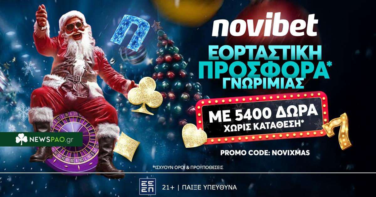 Τα Χριστούγεννα πλησιάζουν και η Novibet το γιορτάζει με μία νέα σούπερ προσφορά* με απίστευτες εκπλήξεις! Η προσφορά θα είναι διαθέσιμη στην πλατφόρμα της έως και τις 09 Ιανουαρίου 2026, για να απολαύσουν όλοι μία μοναδική εμπειρία παιχνιδιού.