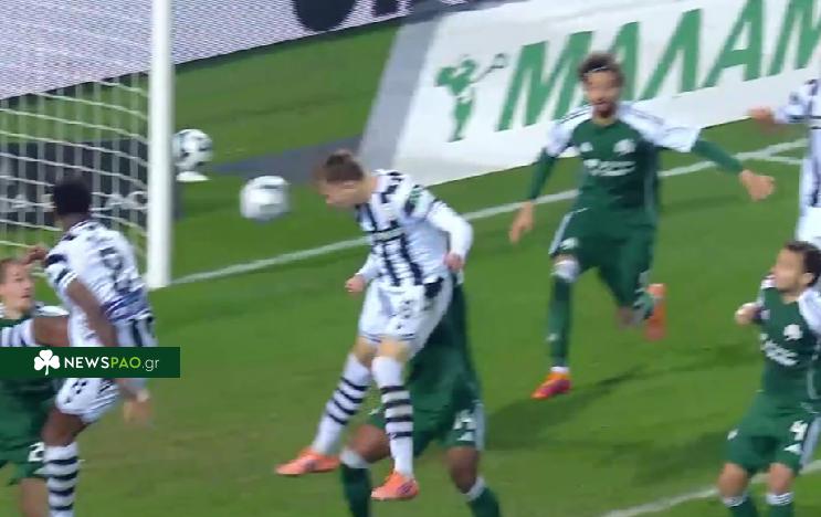 Από εκτέλεση κόρνερ ο Μύθου έπιασε μόνος την κεφαλιά στην καρδιά της περιοχής του Παναθηναϊκού και άφησε «άγαλμα» τον Κότσαρη.