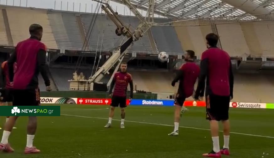 Η αποστολή της Ρόμα προσγειώθηκε στην Ελλάδα και μεταφέρθηκε κατευθείαν στο Ολυμπιακό Στάδιο της Αθήνας για την τελευταία προπόνηση.