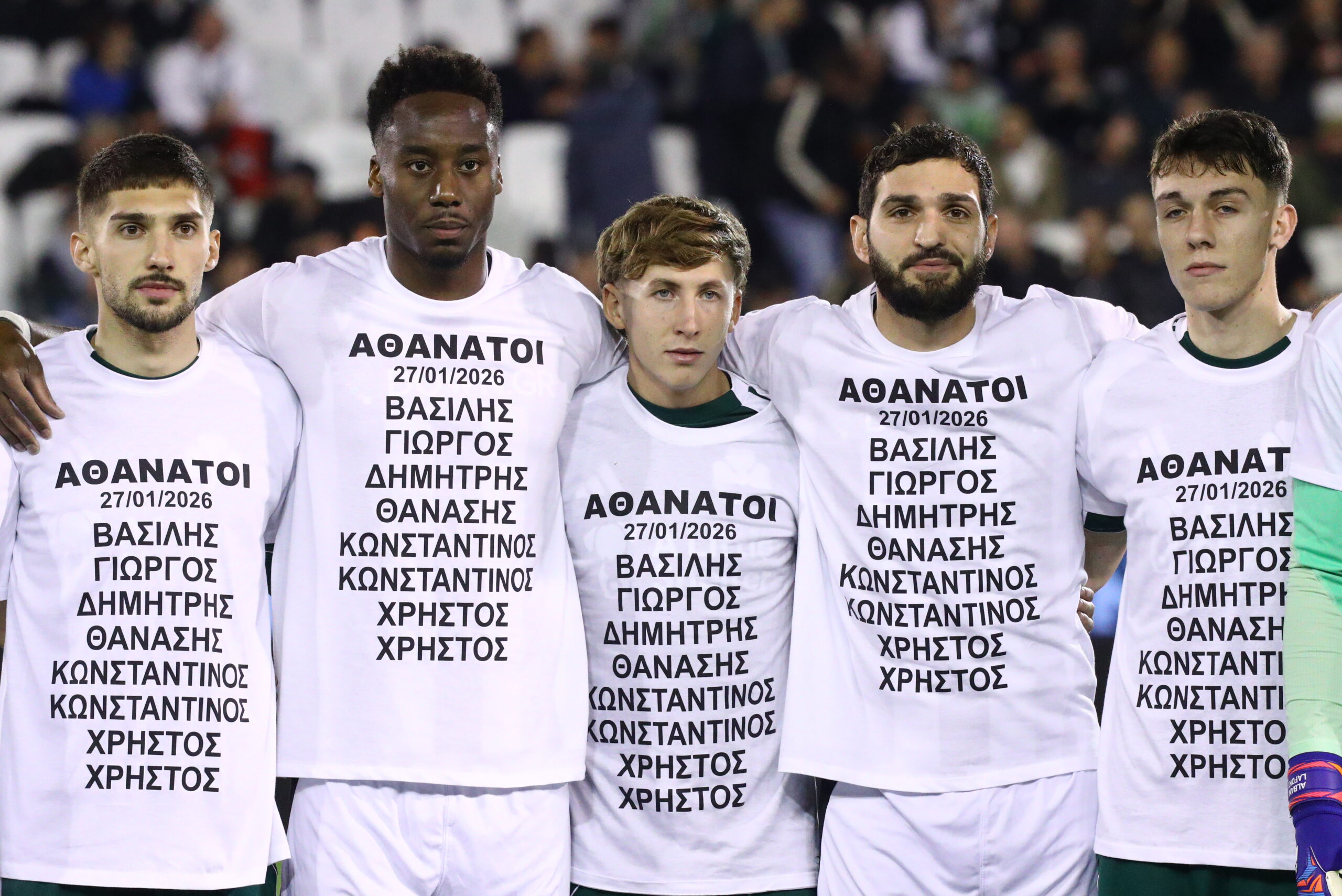 «Με πρωτοβουλία της ΠΑΕ Παναθηναϊκός οι ποδοσφαιριστές των δύο ομάδων αλλά και οι διαιτητές φορούν στην παράταξη μπλούζες με τα ονόματα των παιδιών του ΠΑΟΚ που έχασαν τόσο άδικα την ζωή τους.»