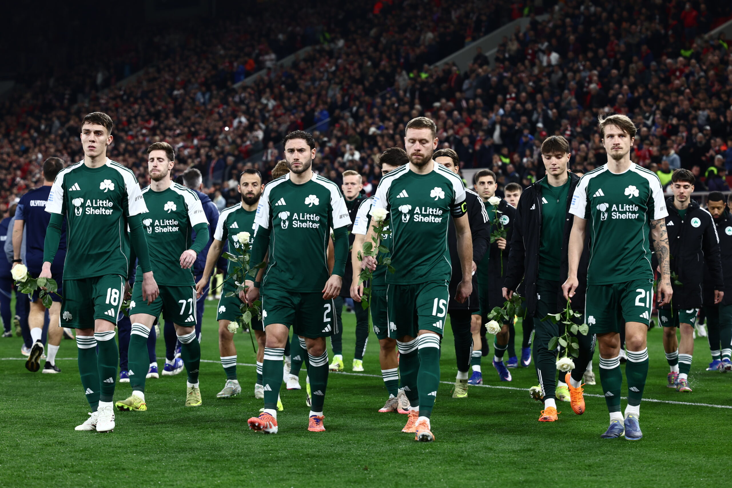 Οι «πράσινοι» με τη σειρά τους άφησαν ένα λουλούδι μπροστά από τη θύρα των οργανωμένων του Ολυμπιακού και γνώρισαν το χειροκρότημα από την εξέδρα.