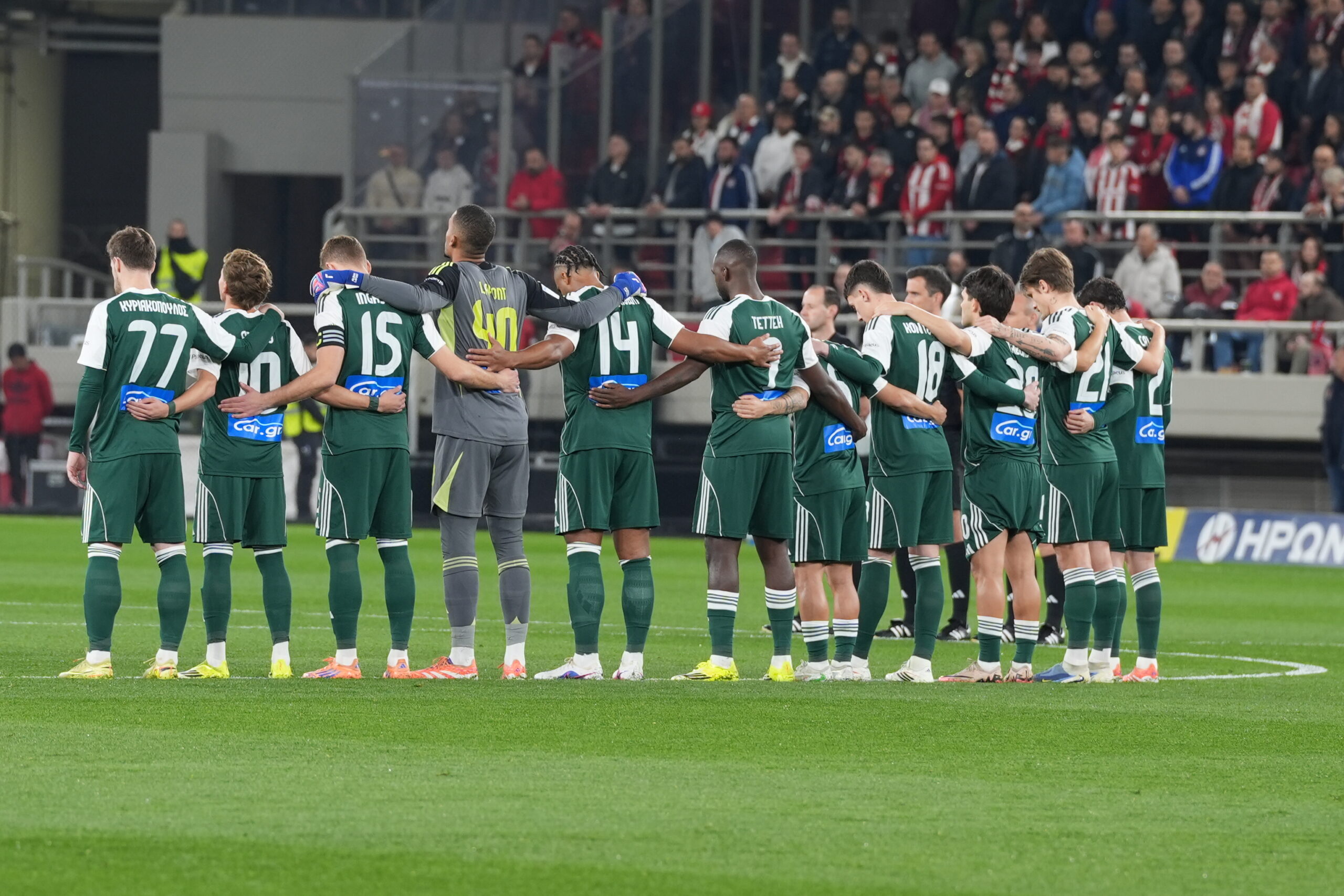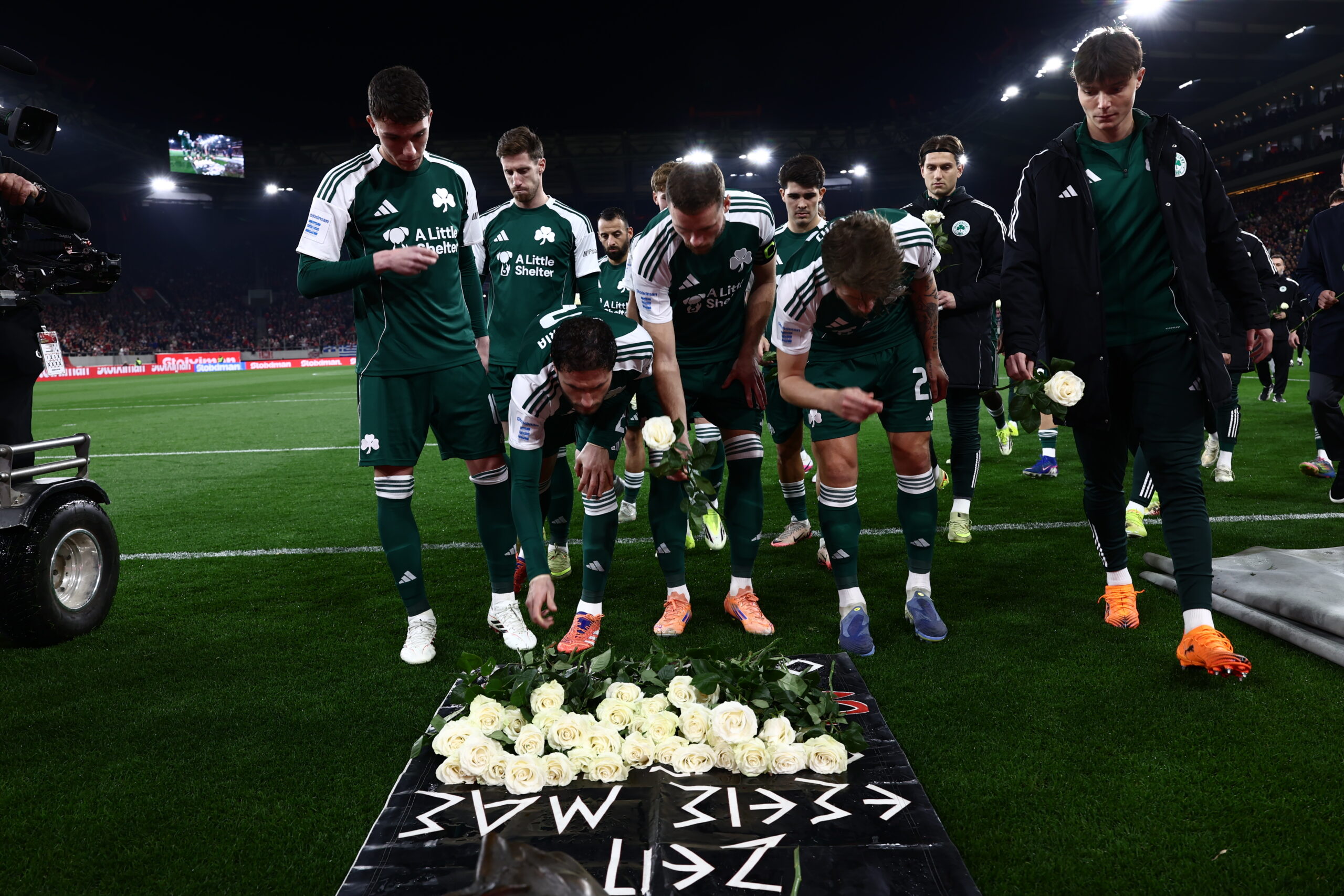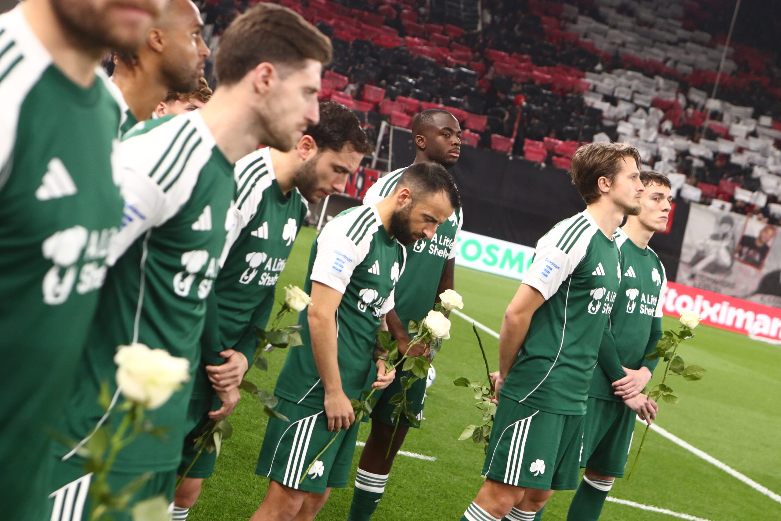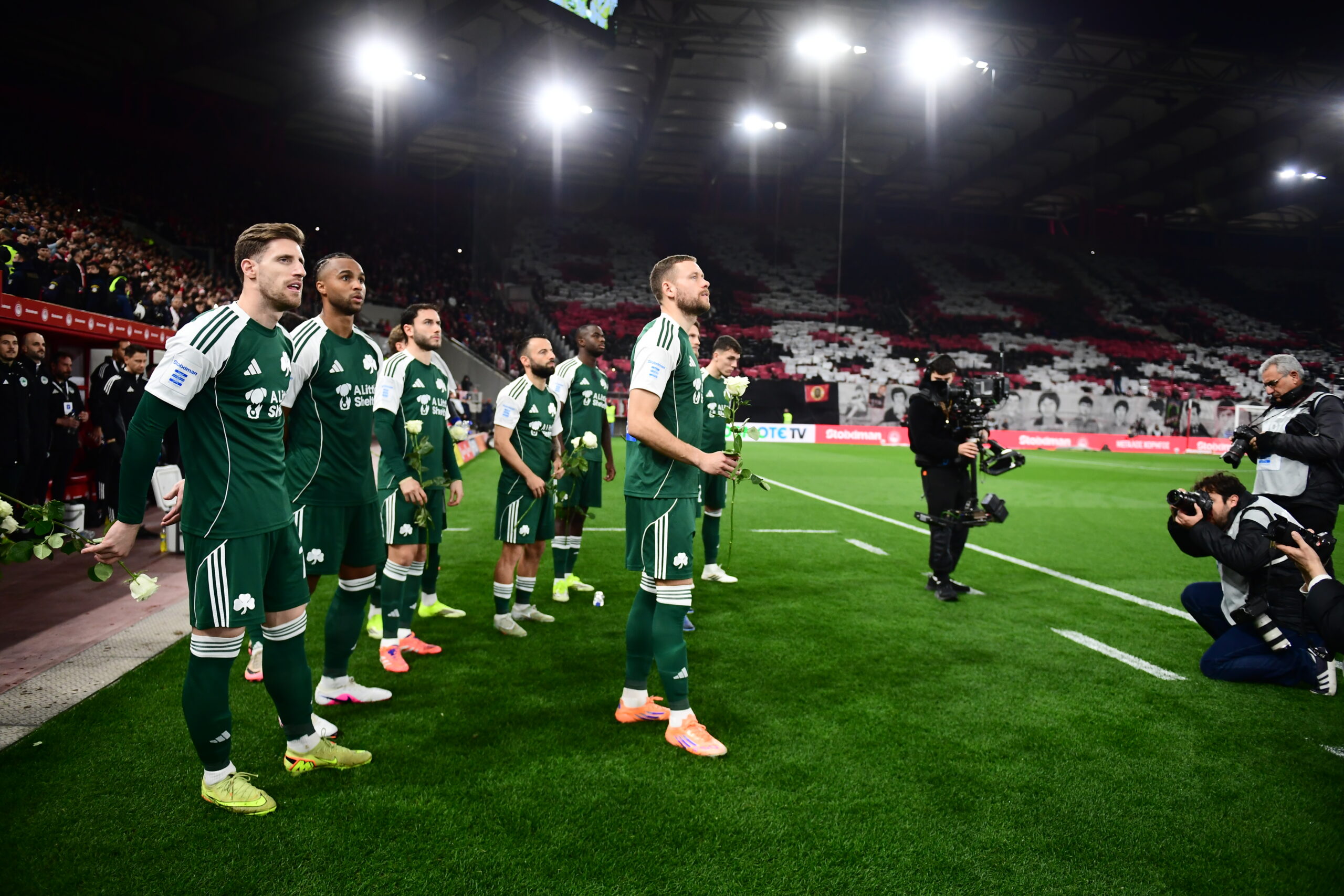 Οι παίκτες του Παναθηναϊκού τίμησαν με ένα λουλούδι τα θύματα της Θύρας 7 και χειροκροτήθηκαν από τους φιλάθλους του Ολυμπιακού.