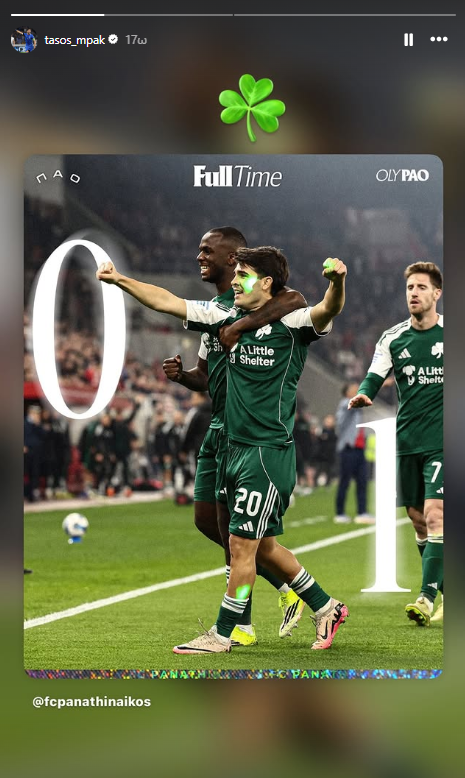 Ο «αρχηγός» του Παναθηναϊκού έκανε μια ανάρτηση με νόημα στο Instagram μετά τη λήξη του παιχνιδιού κάνοντας repost την ανάρτηση της πράσινης ΠΑΕ με ένα μεγάλο «τριφύλλι».
