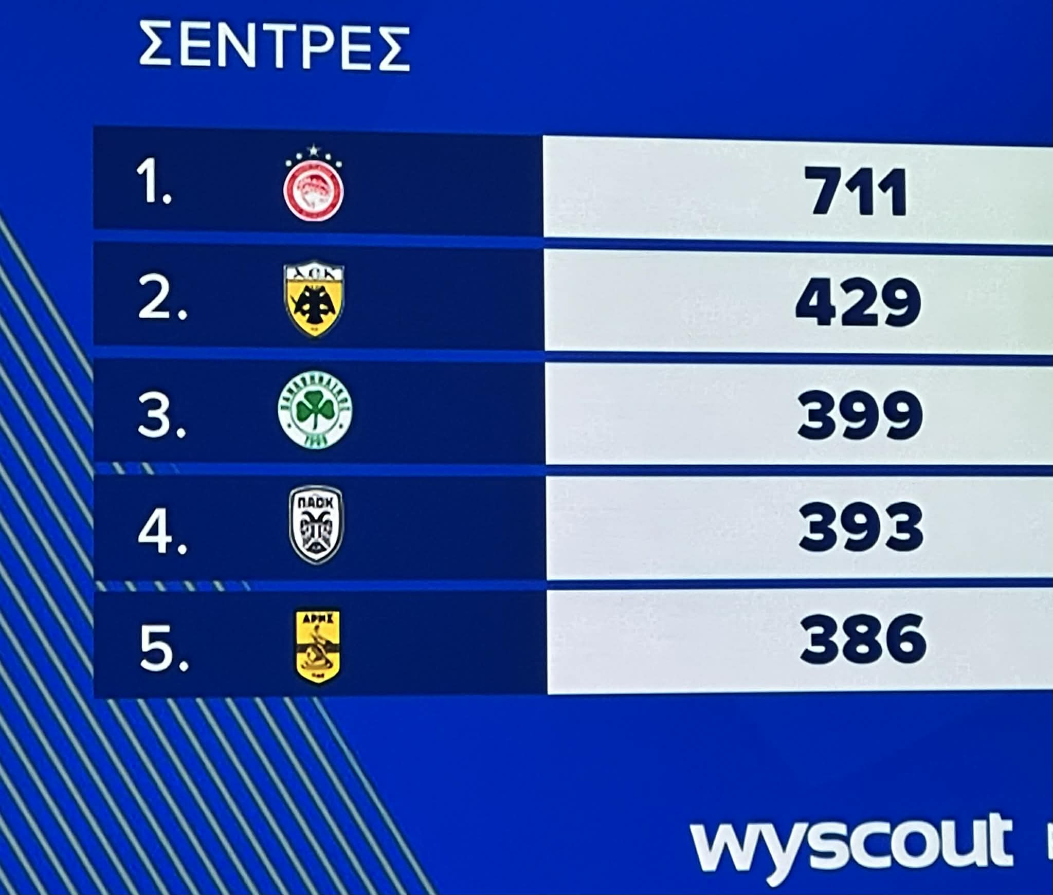 Τη συγκεκριμένη λίστα συμπληρώνουν οι δύο ομάδες της Θεσσαλονίκης με τον ΠΑΟΚ στις 393 σέντρες και τον Άρη στις 386 σέντρες.
