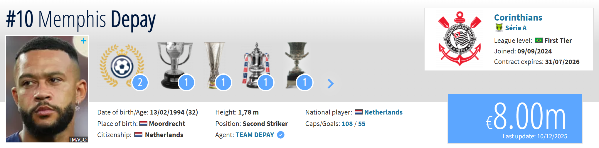 Με limit up στα 55 εκατ. ευρώ ο Ντεπάι κοστολογείται, πλέον, στα 8 εκατ. ευρώ, σύμφωνα με το Transfermarkt (σ.σ έχει σκοράρει στο παρελθόν με τη φανέλα της PSV απέναντι στο Τριφύλλι).