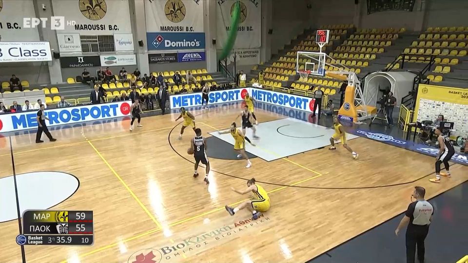 Ο έμπειρος σέντερ «έφαγε» την προσποίηση και βρέθηκε πεσμένος στο παρκέ.