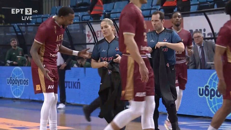 Οι διαιτητές διακόπτουν τον αγώνα λόγω υβριστικών συνθημάτων σε βάρος της κ. Τσαρούχα.