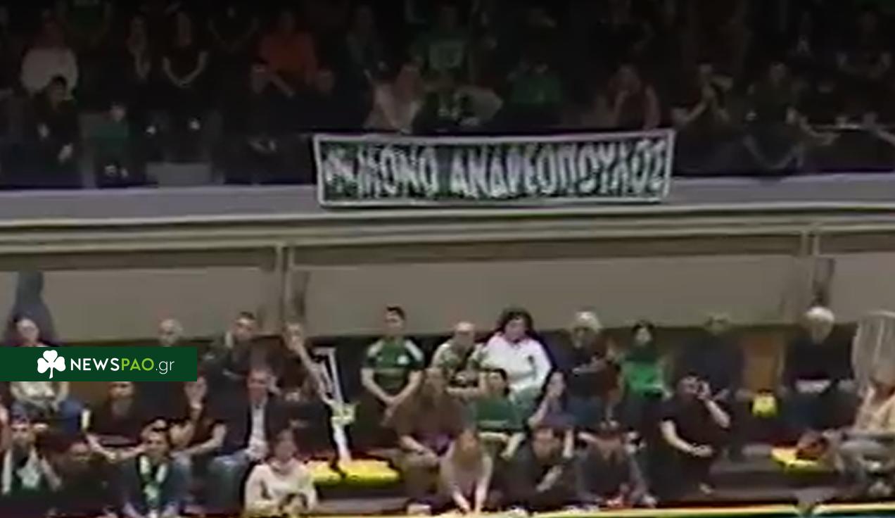 Οι οπαδοί του Παναθηναϊκού σήκωσαν πανό στήριξης στον Δημήτρη Ανδρεόπουλο στο κλειστό του Μετς στο πλαίσιο του τρίτου αγώνα με τον Ολυμπιακό για το πρωτάθλημα.